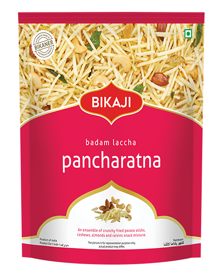 Buy Bikaji Badam Laccha Pancharatna namkeen online. A delicious blend of crunchy potato sticks, almonds, cashews, and raisins with authentic Bikaneri taste. Check nutrition facts, ingredients, and packaging details.