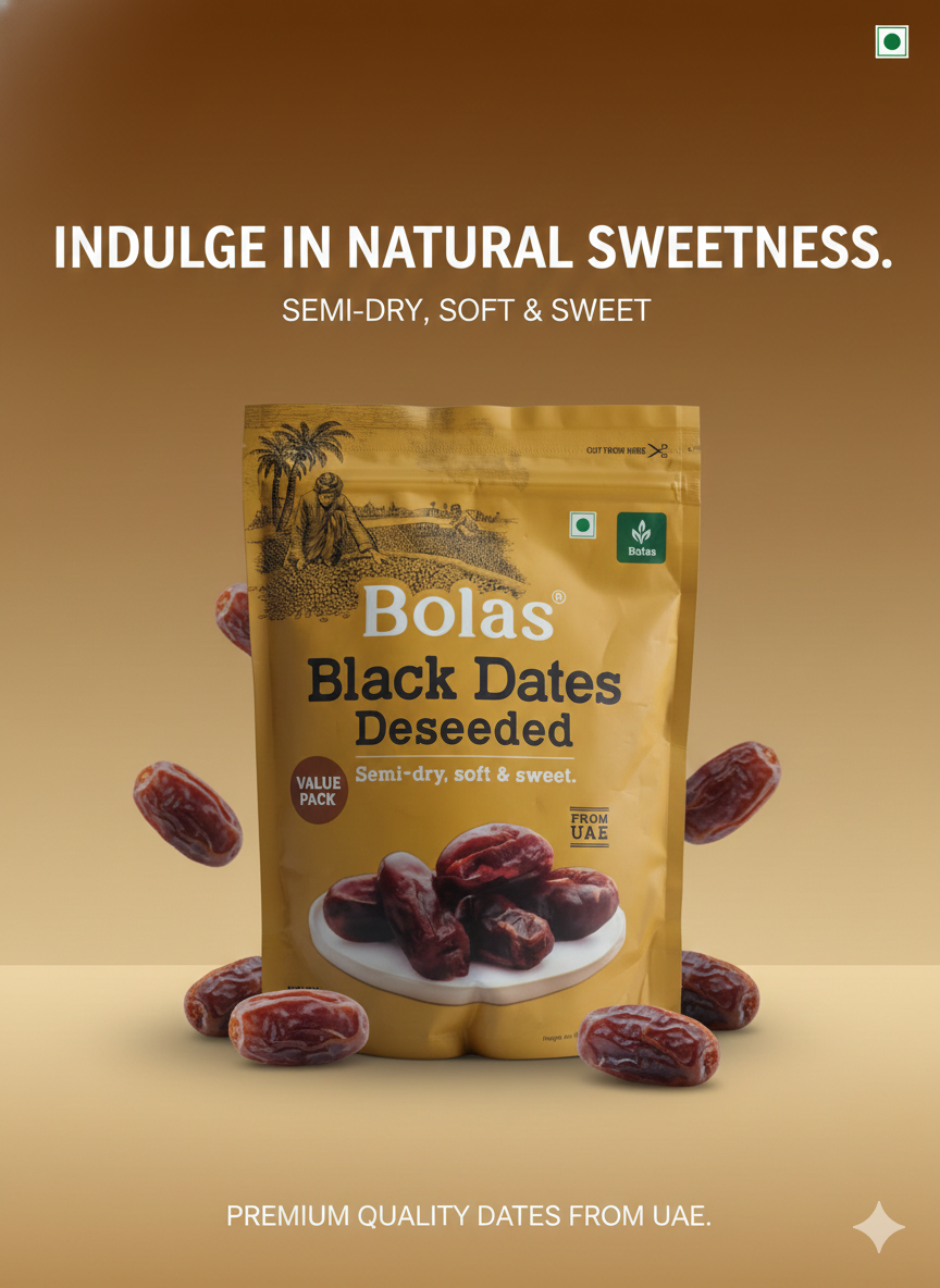 Bolas Black Dates Deseeded premium quality khajoor hain jo UAE se sourced kiye gaye hain. Yeh semi-dry texture ke saath naturally soft aur sweet hote hain, jo healthy snacking ke liye perfect choice hain.