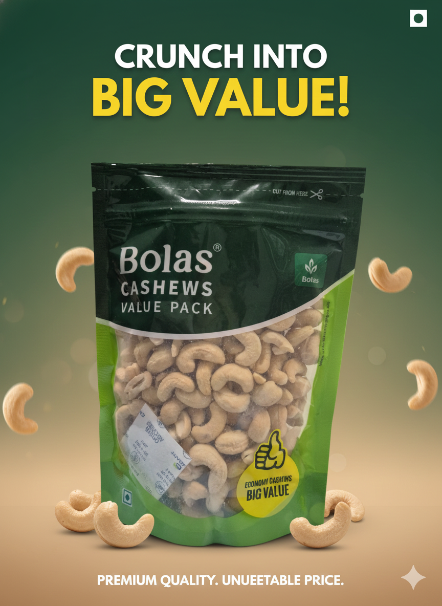 Bolas Cashews Value Pack premium quality whole kaju nuts ka economical pack hai jo daily snacking aur cooking ke liye perfect hai. Carefully selected cashews ka rich taste aur crunchy texture ise har bite me delicious banata hai.