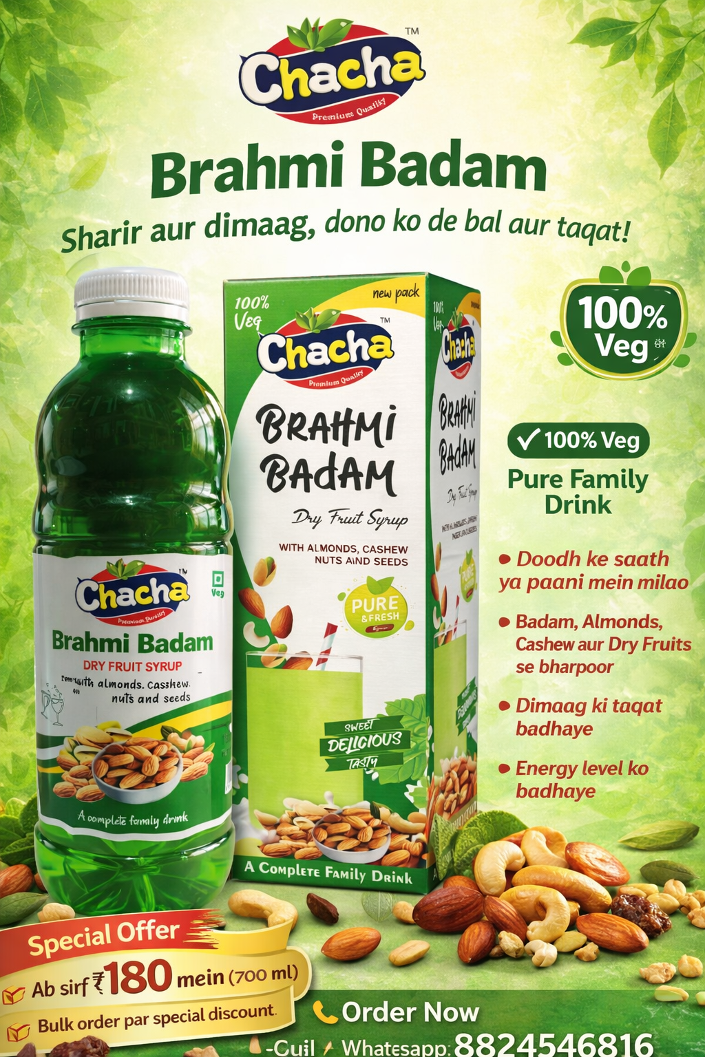 Chacha Brahmi Badam Syrup ek healthy aur tasty dry fruit drink hai jo sharir aur dimaag dono ko energy deta hai. Isme almonds, cashew, aur brahmi jaise ingredients hote hain jo brain power ko improve karne mein madad karte hain.