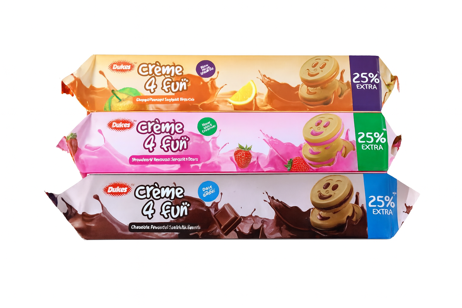 Buy Dukes Crème 4 Fun sandwich biscuits in Chocolate, Strawberry, and Orange flavours. Crunchy biscuits with smooth cream filling. 25% extra pack available.