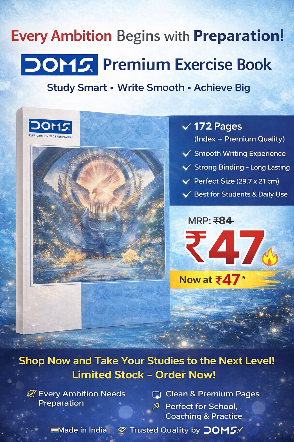 DOMS Premium Exercise Book is designed for students who want quality and performance in their daily studies. It features 172 pages including an index, offering ample space for notes, assignments, and practice.