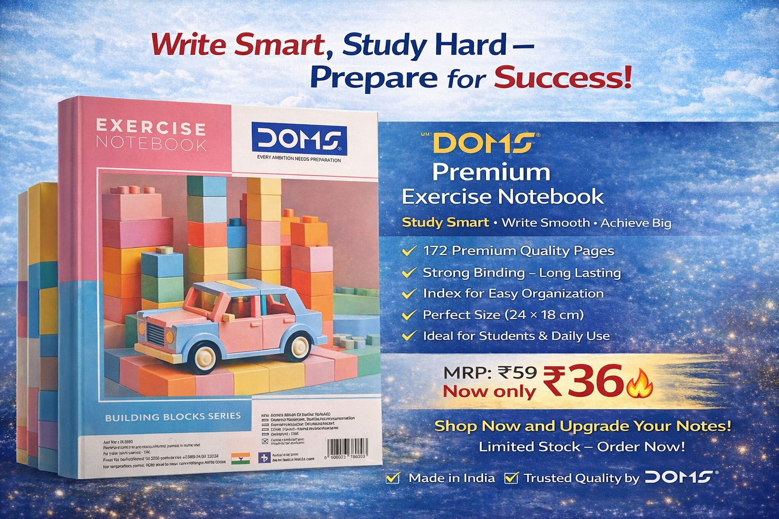 Buy DOMS Premium Exercise Notebook online at the best price of ₹36. This high-quality notebook features 172 pages with smooth writing paper, strong binding for long-lasting use, and a perfect size of 24×18 cm. Ideal for students, schools, coaching classes, and daily writing needs. Designed with an attractive building blocks cover, this notebook ensures both style and performance. Order now and upgrade your study experience with trusted DOMS quality.