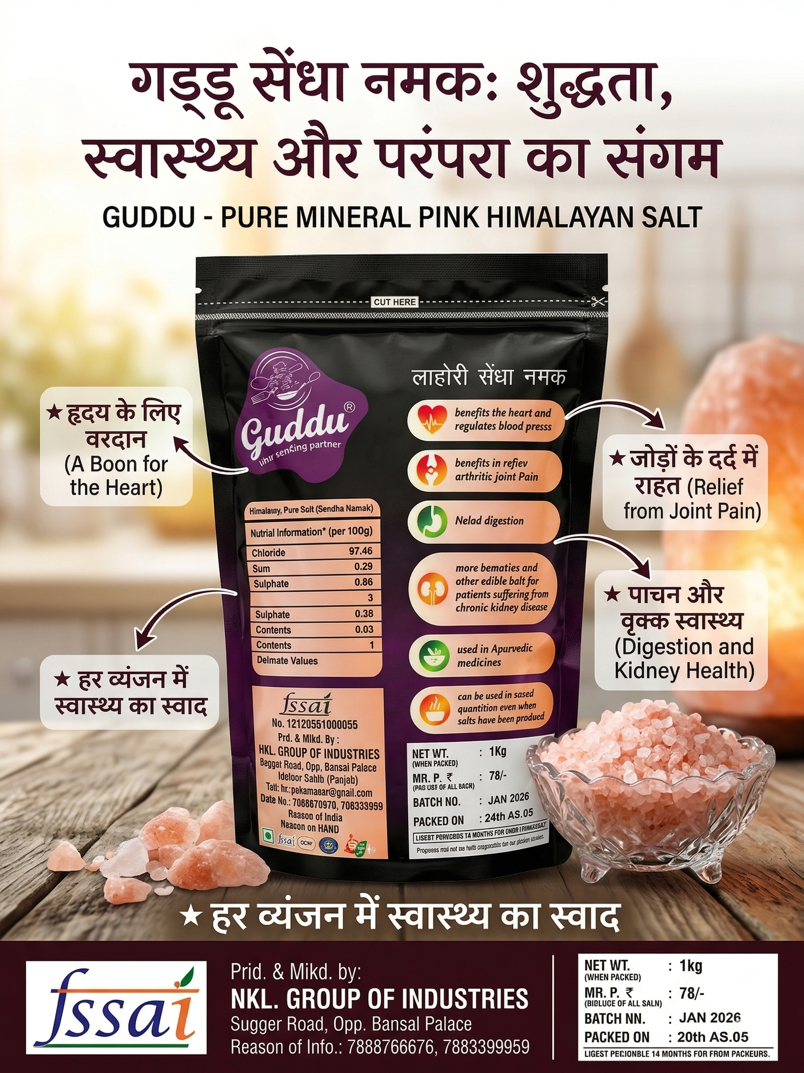 Himalayan Pink Salt (Sendha Namak) is a natural and unrefined salt rich in essential minerals that support overall health. This 1kg pack of Guddu Himalayan Pink Salt is perfect for daily cooking and maintaining a healthy lifestyle. It helps in improving digestion, balancing electrolytes, and supporting heart health.