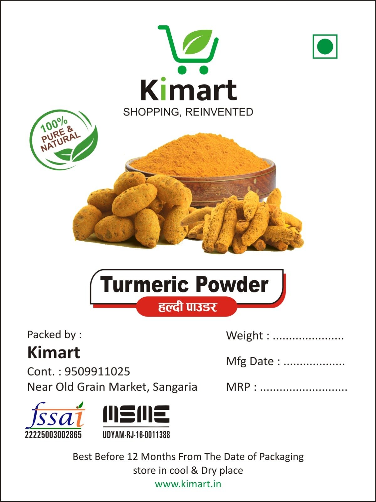 Kimart Turmeric Powder (Haldi) is made from carefully selected, high-quality turmeric roots to ensure vibrant color, strong aroma, and natural flavor.