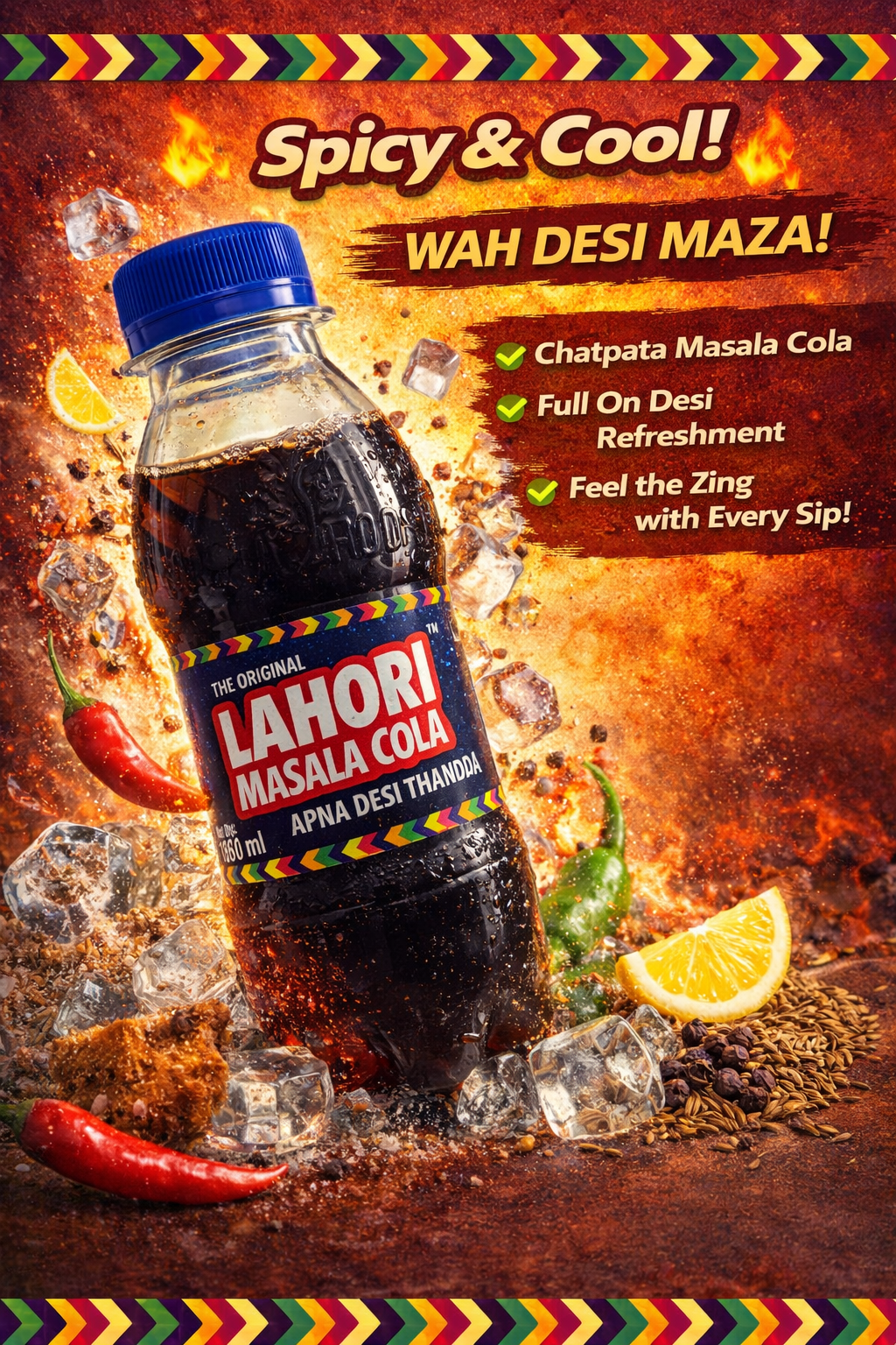 Lahori Masala Cola bottle back label showing manufacturer details, FSSAI license and product authenticity information.