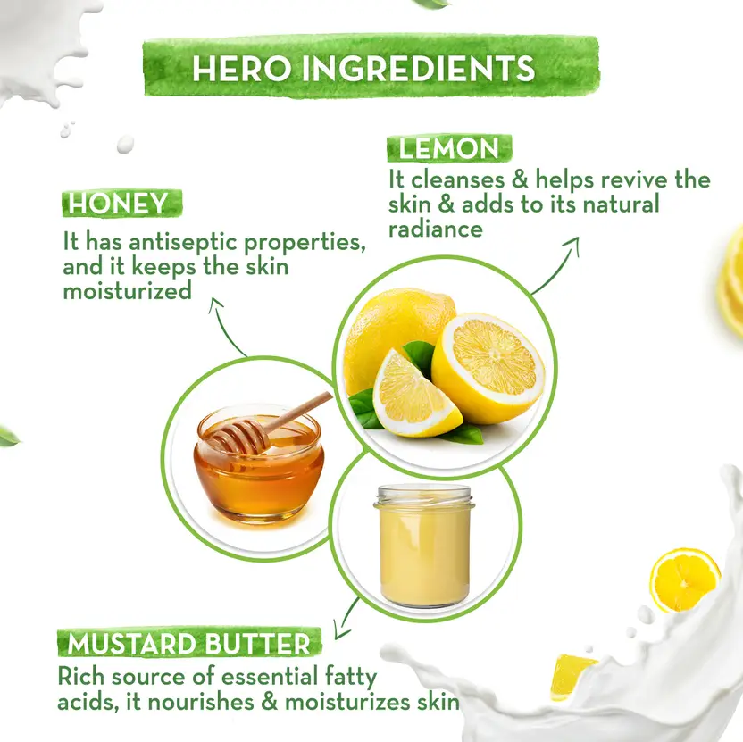 Vitamin C and Lemon help revive dull skin and enhance natural radiance, leaving your skin brighter and refreshed after every wash. Honey, known for its moisturizing and soothing properties, helps keep the skin soft and supple. Mustard Butter, rich in essential fatty acids, deeply nourishes and protects the skin from dryness.