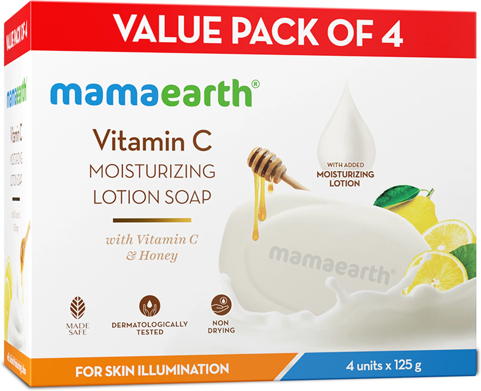 Mamaearth Vitamin C Moisturizing Lotion Soap with Honey deeply cleanses while keeping your skin soft and hydrated. Enriched with Vitamin C, Lemon, Honey, and Mustard Butter, it helps brighten dull skin and prevents dryness. Dermatologically tested and suitable for daily use. Value Pack of 4 (125g each).