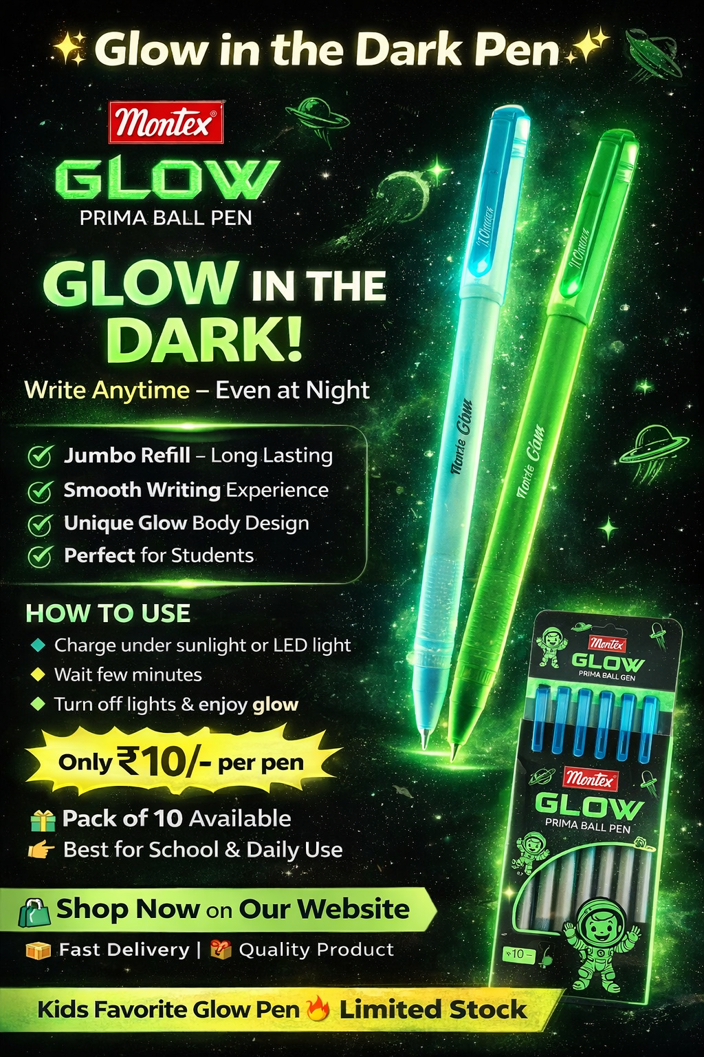 The Montex Glow Prima Ball Pen is a unique and fun writing tool designed especially for students and everyday use. Its special glow-in-the-dark body makes it stand out, allowing you to enjoy writing even in low-light conditions.