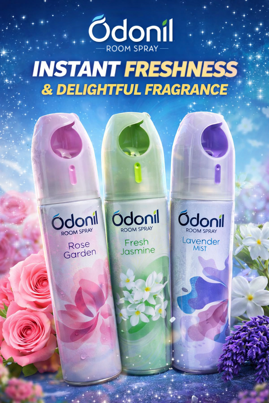 Odonil Room Spray is a premium air freshener designed to bring instant freshness and a delightful fragrance to your living spaces. Available in refreshing variants like Lavender Mist, Rose Garden, and Fresh Jasmine, it effectively eliminates unpleasant odours and fills your home with a soothing aroma.