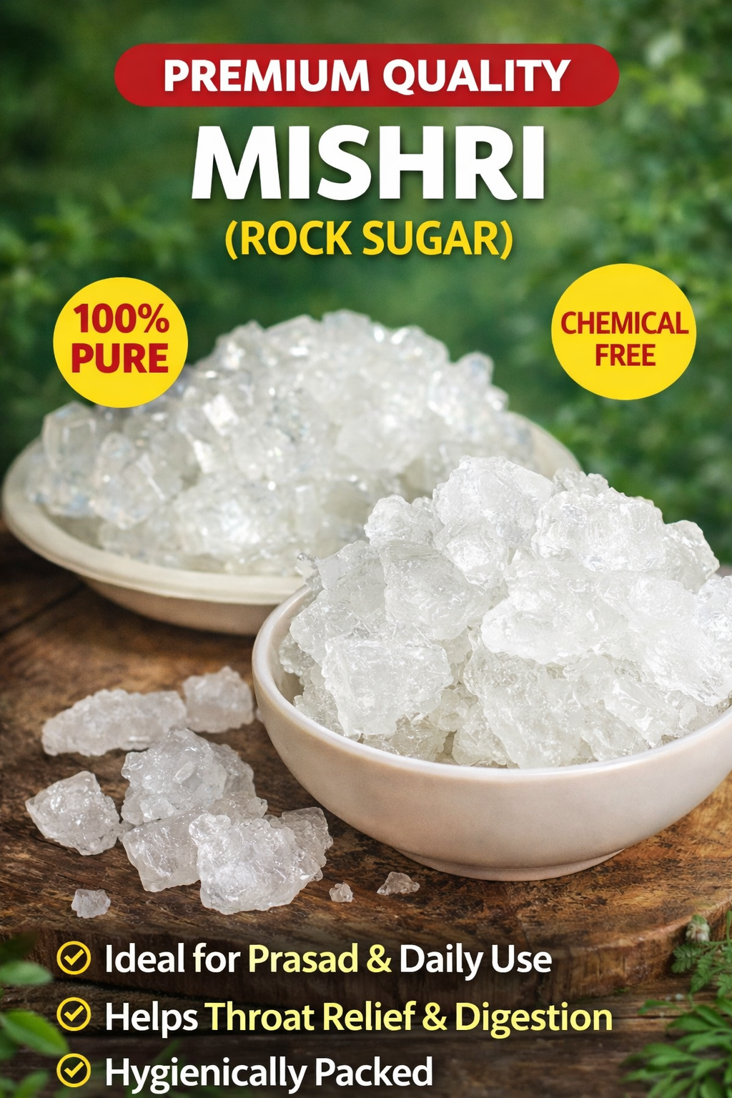 Premium quality mishri (rock sugar) is made from natural sugar crystals, known for its purity, sweetness, and health benefits. These large, translucent crystals are widely used in Indian households for prasad, traditional remedies, and as a healthier alternative to refined sugar.