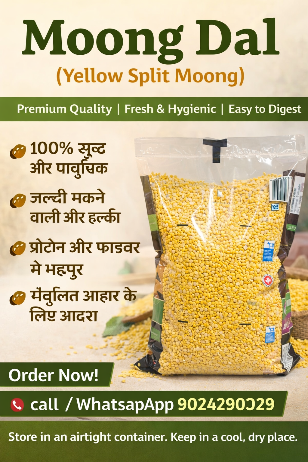 Our Premium Yellow Split Moong Dal is 100% pure and natural, carefully selected to ensure the highest quality. It is fresh, hygienically packed, and easy to digest, making it ideal for everyday cooking. Rich in protein and fiber, this dal supports a balanced and nutritious diet. Perfect for preparing dal, khichdi, soups, and other healthy Indian recipes. Store in an airtight container in a cool, dry place for long-lasting freshness.