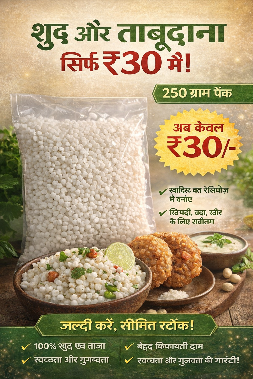 Get premium quality sabudana (sago pearls) at the best price of ₹30 for a 250g pack. These clean and fresh white sabudana pearls are ideal for preparing delicious dishes like sabudana khichdi, sabudana vada, and kheer, especially during fasting (vrat). Carefully packed for hygiene and quality, this sabudana ensures great taste and texture in every meal. Perfect for home use, grocery stores, and daily cooking needs. Order now and enjoy fresh and high-quality sabudana at an affordable price.