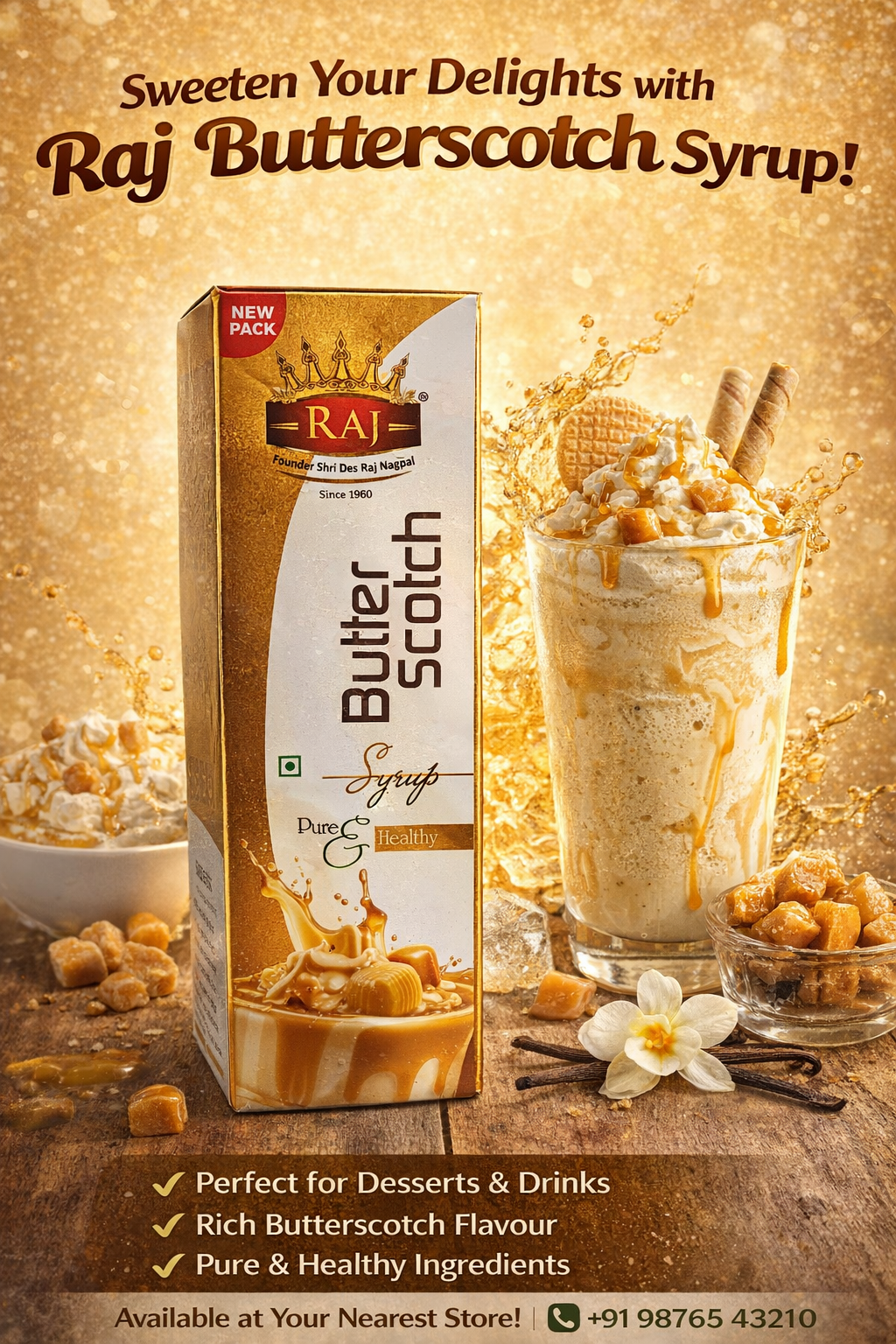 Raj Butterscotch Syrup is a delicious and premium-quality syrup designed to enhance the taste of your favorite drinks and desserts. With its rich and creamy butterscotch flavor, it is perfect for preparing milkshakes, ice creams, cold coffee, and dessert toppings.