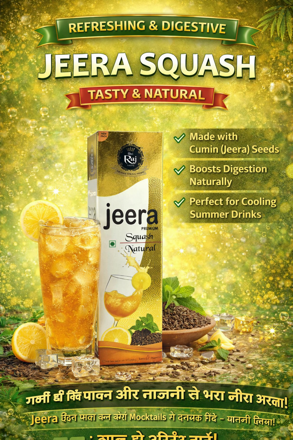 Shri Raj Jeera Squash is a flavorful cumin-based syrup that provides a refreshing and digestive drink, ideal for summer and daily consumption.