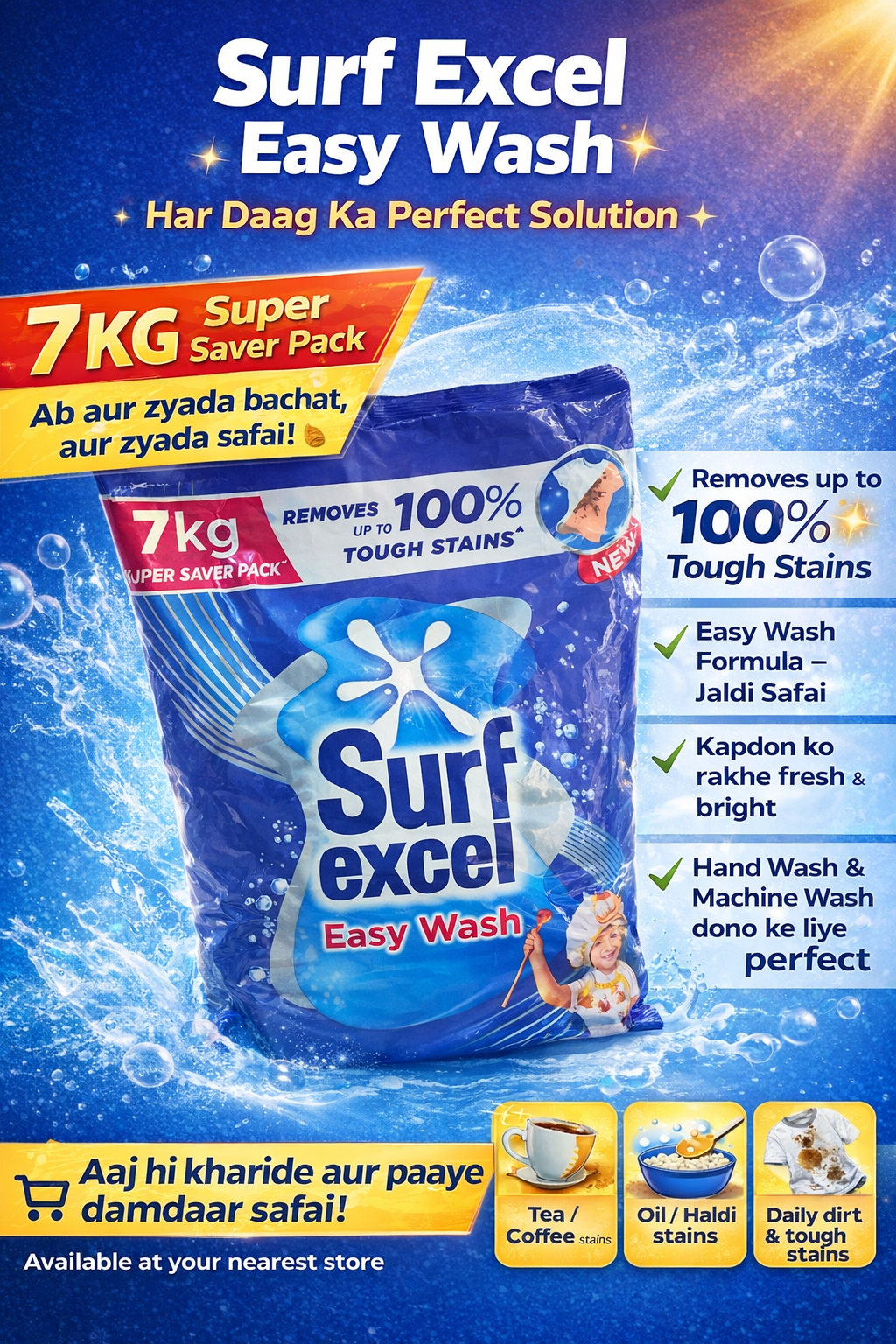 Surf Excel Easy Wash 7kg Super Saver Pack is a powerful detergent designed to remove tough stains easily while keeping clothes fresh and bright. Its advanced formula helps in removing up to 100% tough stains like tea, coffee, oil, haldi, and daily dirt.