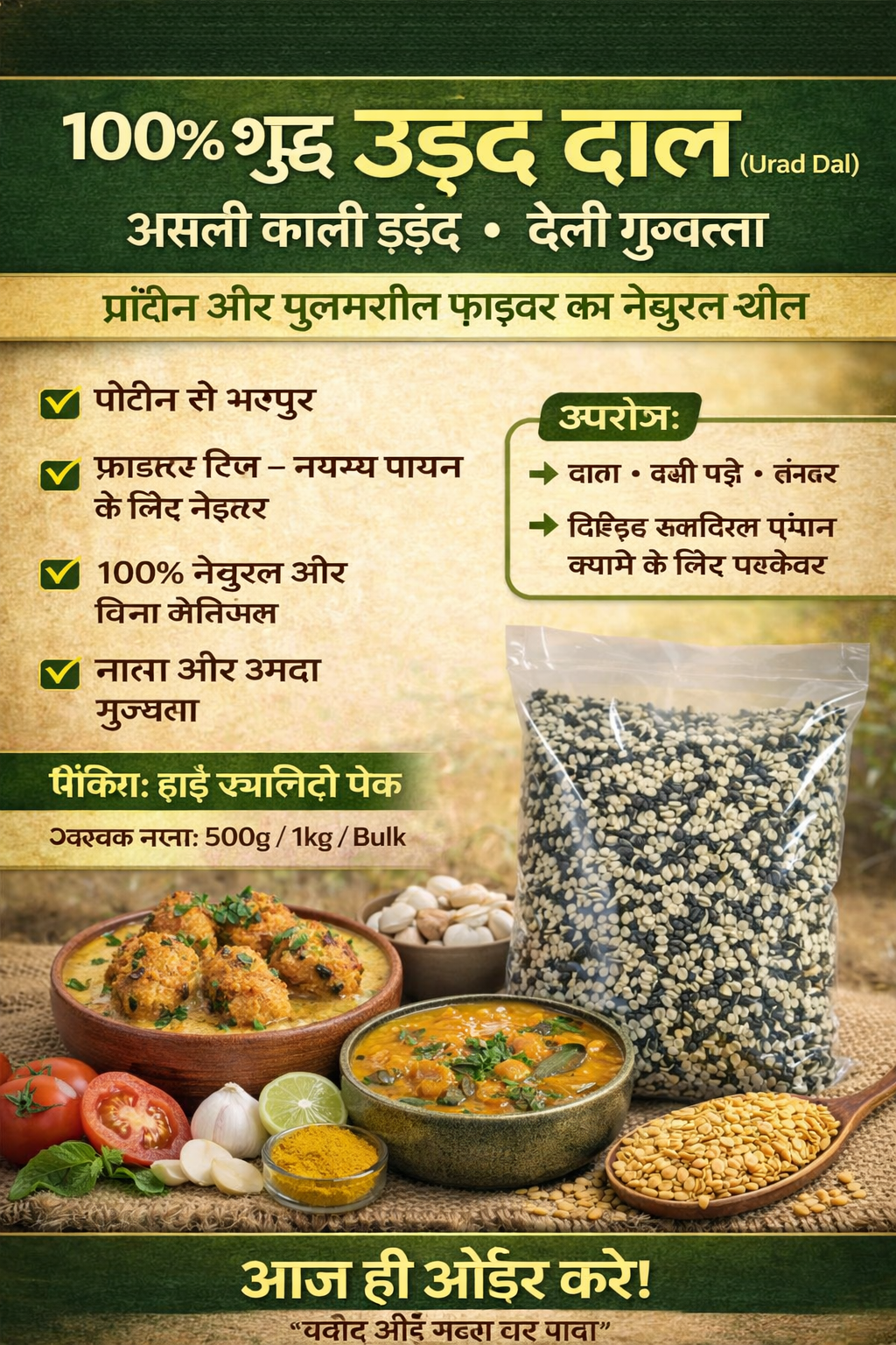 This 100% pure and fresh Urad Dal (split black gram with skin) is a highly nutritious and essential ingredient for Indian kitchens. Packed with protein, fiber, and essential nutrients, it supports muscle strength, digestion, and overall health.